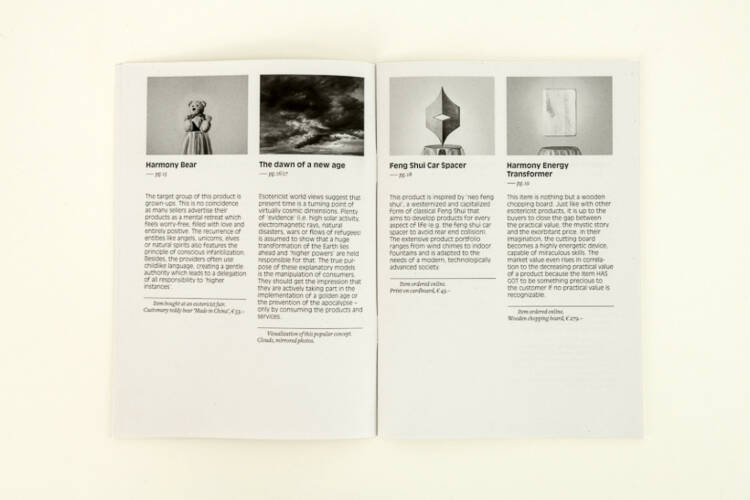 A book on irrationalism, new age esotericism, pseudo-science, conspiracy theorists and the current post-truth-era. New age esotericism is only one of several new and uprising belief systems which claim to have discovered their own (spiritual, political or pseudo-scientific) model of 'truth'. Esotericist theories - no matter how speculative or irrational they may be – are slowly but surely making their way into the centre of mainstream society. They are not only games played with the hopes of gullible or desperate people, they are also profitable business models somewhere in between marketing and promises of salvation. Klaus Pichler wanted to know more: for a period of two years, he immersed himself into the scene by pretending to be a fanatic esotericist. He joined online forums, attended esotericist fairs and gatherings, familiarized himself with relevant theories, ordered products and made use of services. This enabled him to gain an inside view of the irrational world of esotericism, filled with remote healing, aura sprays and unicorn essences. In the process, he witnessed a mixture of credulity, quackery and betrayal. The result of Klaus Pichler's approach is the series ‘This will change your life forever’, consisting of pictures of products, re-stagings of images found on online forums and visualizations of esotericist theories. Some names have been changed but all products are genuine and all quoted texts are authentic. Nothing in this project is fake, or, not faked by him at least.