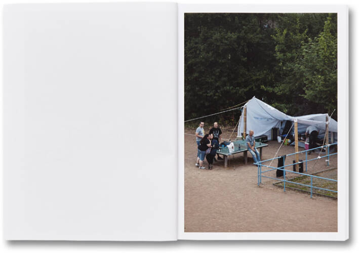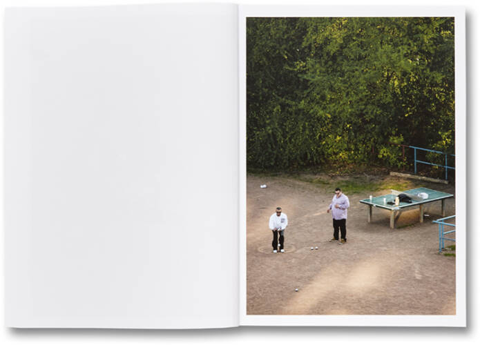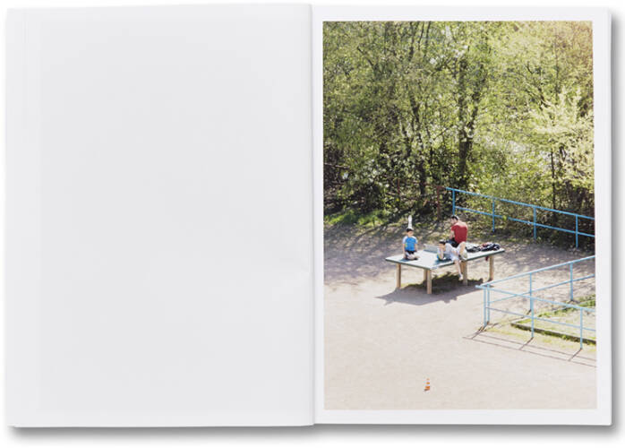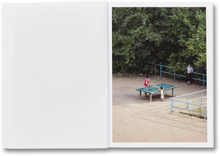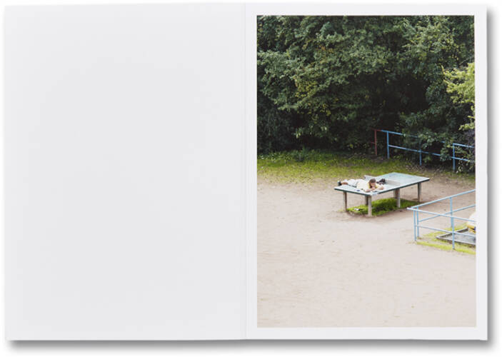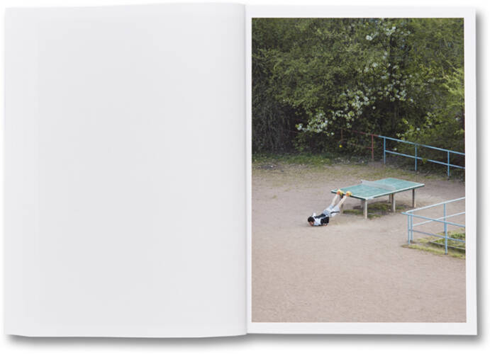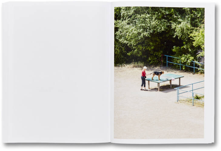 TTP is a series of photographs made from the window of Hayahisa Tomiyasu's eighth-floor student apartment in the German city of Leipzig. His southfacing view encompasses a public park with a ping pong table, which is the focus of his deadpan pictures. Each image is similarly composed, while the times of day, the seasons and the visitors to the table change. As we turn the page the function of the table mutates, from a tischtennisplatte (table tennis table) to a sun bed, a skate obstacle, a laundry counter, a kids' climbing frame, a work-out meeting spot, and a refuge from busy streets, among numerous other uses. Thanks to Tomiyasu's sustained curiosity, we observe the habits, humour and idiosyncrasies of human behaviour at the foot of this humble table.