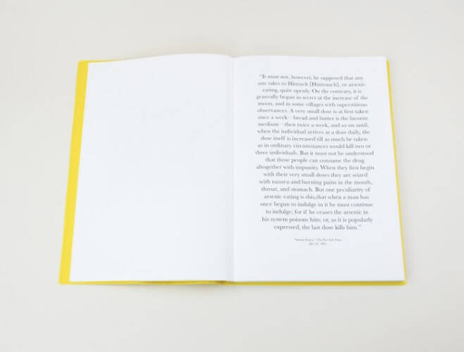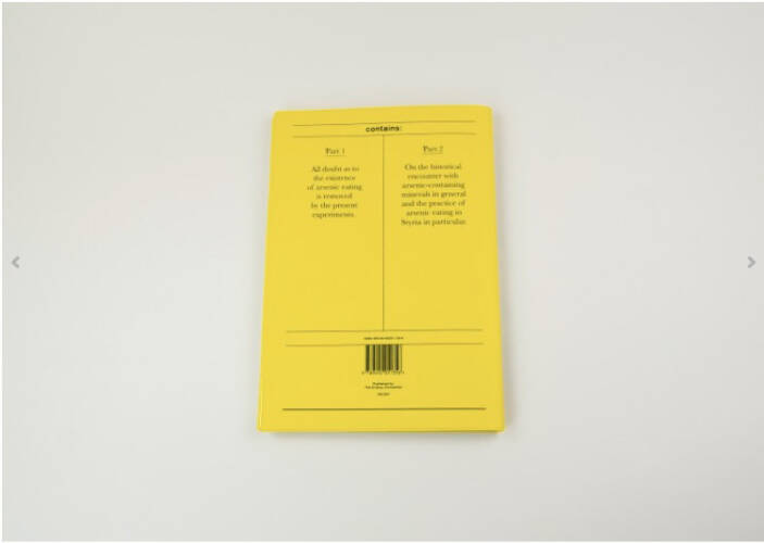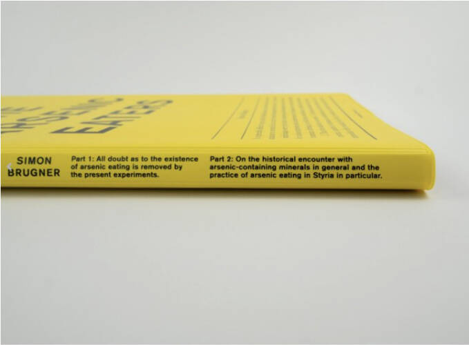 The book consists of two parts. The first, contemporary part, traces the poison eaters and tries to find a link between the past and the present. It sketches a possible reality in which the obscure habit of arsenic eating is conceivable. The second part presents Brugner’s research, mainly based on medical papers from the nineteenth, early twentieth century and on-location findings. The book features contemporary photographs as well as archival material.