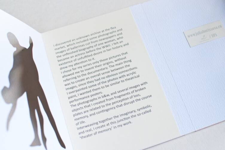 "I discovered an unknown archive at the flea market, which included some photographs and images of ballerinas cut from newspapers and the unfinished biography of one woman, who became an actress before the WWII. I felt an existence of unfulfilled desire in her history and drew my attention to it. I chose for my series only those pictures that allowed me to invent their origins, without referring to the documentary. The main thing was to create an overall sense between the images, since they had no obvious connections. I overpainted some of the photos with acrylic paint, I wanted them to be similar to theatrical performance posters. The photographs in b&w and several images with objects that I created from fragments of broken plates are related to the perception of loss, memory, and contingency that disrupt the course of life. Interweaving together the imaginary, symbolic, and real, I create at this junction the so-called 'theater of memory' in my work."
