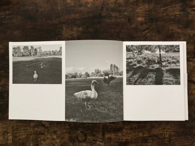 Goosewalk tells the story of a slaughterhouse-runaway goose who settled on a golf course and has been accepted by three wild geese. It has not been a coincidence that they landed at a golf course because geese can only eat short grass. Here she lives in freedom, although still protected, endlessly being served freshly mowed grass on a platter. Only the winters are lonely, when the wild geese fly south. But come spring, the birds happily reunite on the same pond.