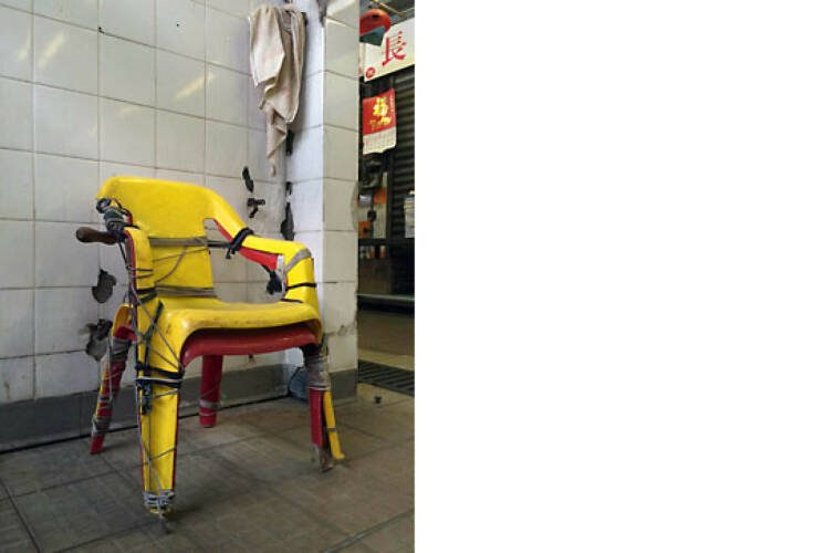 Street chairs. Old and new, whole, broken, rebuilt and repaired. Together with alienated crates, cartons, wooden blocks and jerry cans they form peculiar roadside seating ensembles for the short relaxation or a little chat in between.