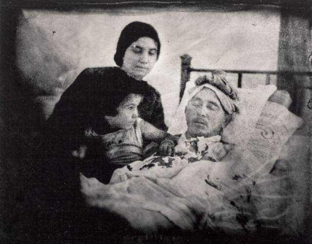 The idea of ‘a photographed image becoming permanent’ that was birthed from the discovery of Camera Obscura, marks the starting point of the artist’s work. Şen, with his own narration of found photographs, brings news life to the images that were on the edge of disappearance and fading. The exhibition takes its title, ‘Fading Away’, from the withering of the images. The negative films and found photographs, re-interpreted and reproduced, were derived from the archives of Foto Kandiye, Foto Turan, and reflect the events of student ceremonies, institutional health inspections, societal sorrowing, instances of destruction, and ‘orphan’ portraits. The artist brings today’s audience in dialogue with the photographers who, at the time, documented scenes of war, illness, celebration, family, and tradition. Şen, who aims to convey the concepts of urban awareness and human psychology through photographs of individuals, instead of various construction visuals which were previosuly the main subject in his ‘Wet City’ series, now mostly procudes his work by using technique of wet collodion as well as various other antique photography methods. The images therefore often travel between the positive and negative, black and white, lightness and darkness. The artist, well aware of such journey, slows down his own process, drawing attention to the intricate and detailed ways in which the final artwork is produced. Referencing the identityless persons in the composit photograph series by H.P. Robinson titled ‘Fadin Away’, the portraits become reimagined subjects whose stories we wouldn’t have been ever known. What is crucial for the artist here, is that beyond all faces in the portraits being of anonymous individuals whose life has passed, the tangible photographs themselves go through a form of metapmorphosis in time, becoming sickly and worn out pieces.