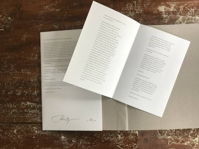 Comments: Collector's Edition of 25 copies. Book size: 24 x 18,5 cm. Book: Edition of 350 signed and numbered copies including the collector's editions with a signed print (25 different motifs in the size of 20 x 15 cm, printed on Hahnemuehle PhotoRag Ultra Smooth paper). Available motifs can be seen in the preview. Please contact us if you want to choose the motif of the print. Prices (not by numbers but by sold copies): 21-23 Euro 220, 24-25 Euro 350. Handwritten title on the cover.