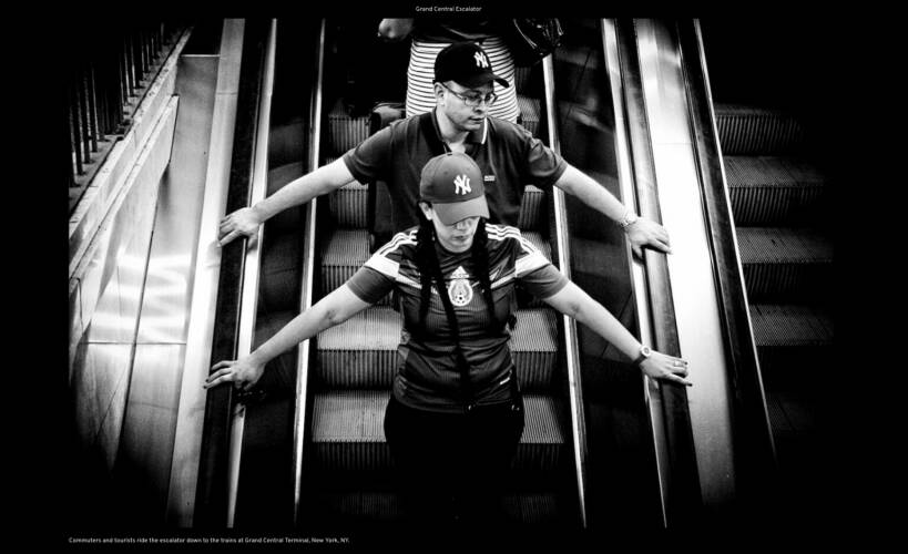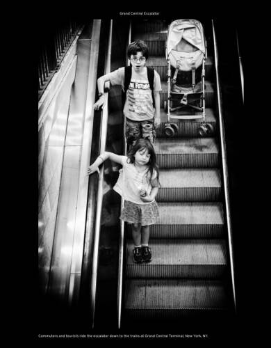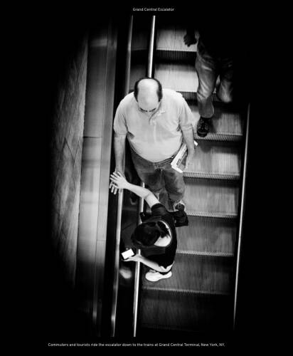I decided to hone in on an escalator at Grand Central, where people stood still, while (ironically) in motion. It was the one place in the station where the cacophony of movement streamed into one line. Here, people stared into space, disengaged, while others acknowledged me, even performed for me. Then they were gone...