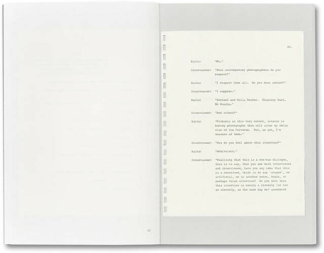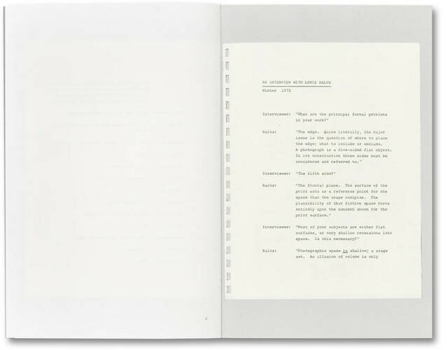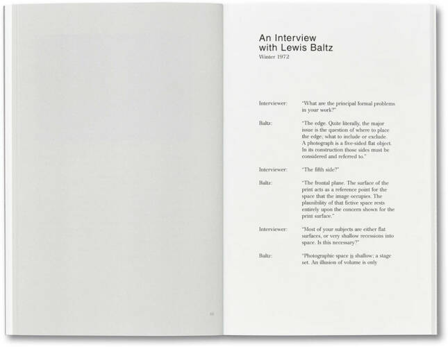 In 1972, as his career was beginning to take off, Lewis Baltz conducted a revealing interview, his first considered statement about photography. Never published, the interview has recently resurfaced, and is printed here for the first time. In an increasingly sardonic exchange Baltz describes the character of his practice, articulates his position within and against the world of photography, and comments on his intellectual heritage and professional ambition. A penetrating exploration of the character of his medium, Baltz’s artistry and mercurial presence are strikingly laid bare.