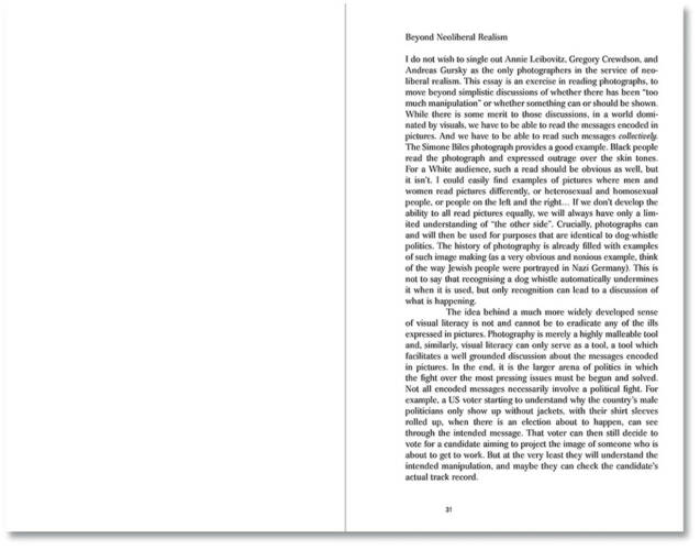 Confronting the work of widely celebrated photographers Annie Leibovitz, Gregory Crewdson and Andreas Gurksy, Photography’s Neoliberal Realism examines how these artists produce capitalism’s equivalent of the Soviet Union’s socialist realism by giving photographic form to widely held and rarely questioned beliefs and ideas. The ideological framework that Colberg terms ‘neoliberal realism’ serves to cement an economic system whose many fault lines are becoming increasingly clear, such as staggering inequality and racial disparities. This extended essay provides an alternative reading of photographic works laden with artifice, and argues how focusing on this artifice misses the more far-reaching ways such images operate in our visual economy.