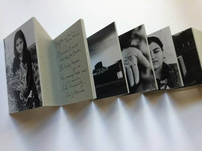 Claire Felicie, a photographer based in Amsterdam, visited Iraqi Kurdistan twice: in 2017 and 2018. This handmade leporello gives an impression of these journeys and her encounters with female Peshmerga fighters. She shot the portraits and landscapes on film and printed all postcard-size photos in her own darkroom. The outcome: this leporello with an additional handwritten letter, is a celebration of hand labor. An ode to analog photography in a digital age.