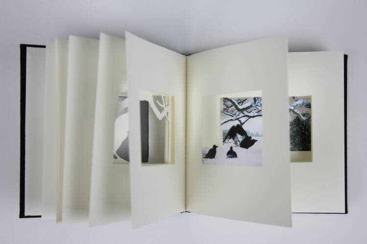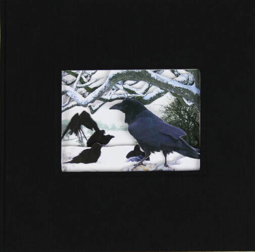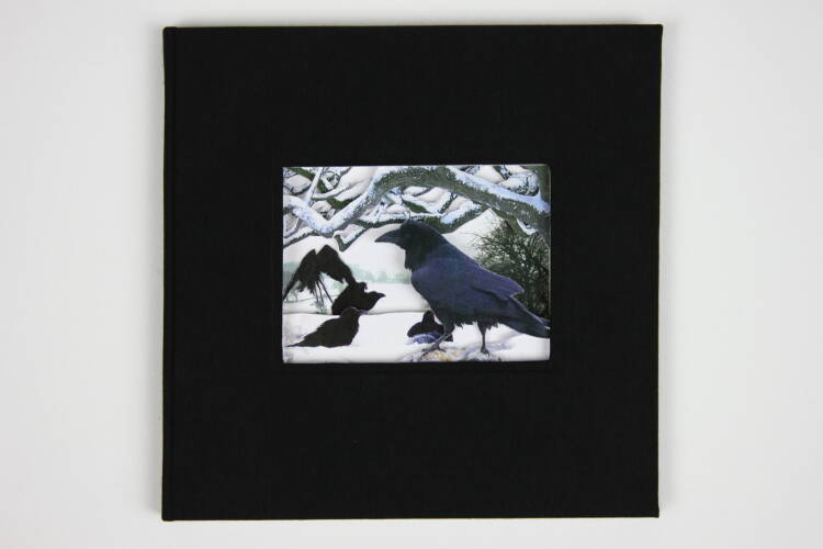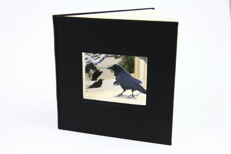 A gathering of ravens… This hand-bound book in square format has an intricate, hand-cut design depicting ravens in a snow-filled winter landscape. The scene is cut into the pages of the book at different depths, creating a three-dimensional effect which changes as you leaf through the book. This three-dimensional design can even be seen when the book is closed, thanks to the innovative ‘window’ in the front cover.
