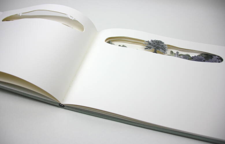 A book to lose yourself in… This blank-paged, hand-bound book in landscape format has an intricate, hand-cut design with picture elements attached in the upper part of the pages. The scene is cut into the pages of the book at different depths, creating a three-dimensional effect which changes as you leaf through the book. This three-dimensional design can even be seen when the book is closed, thanks to the innovative ‘window’ in the front cover.