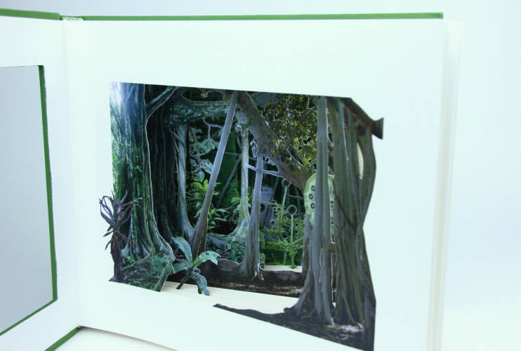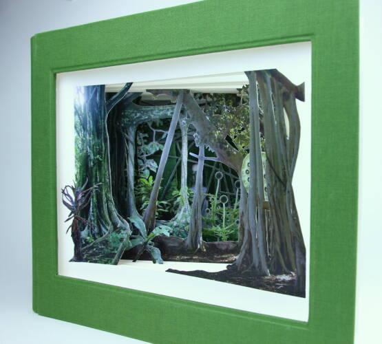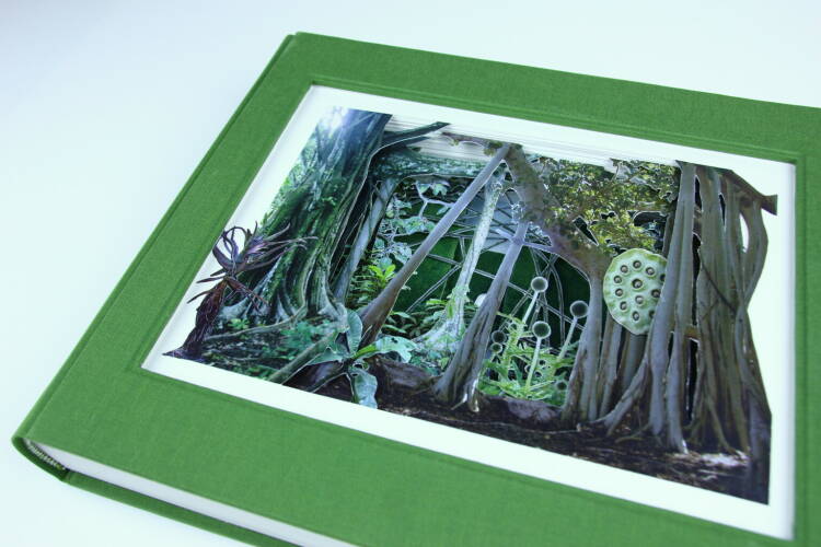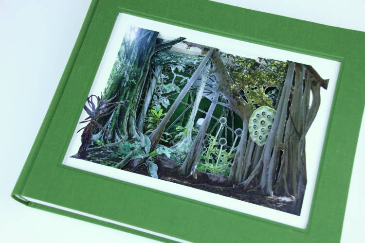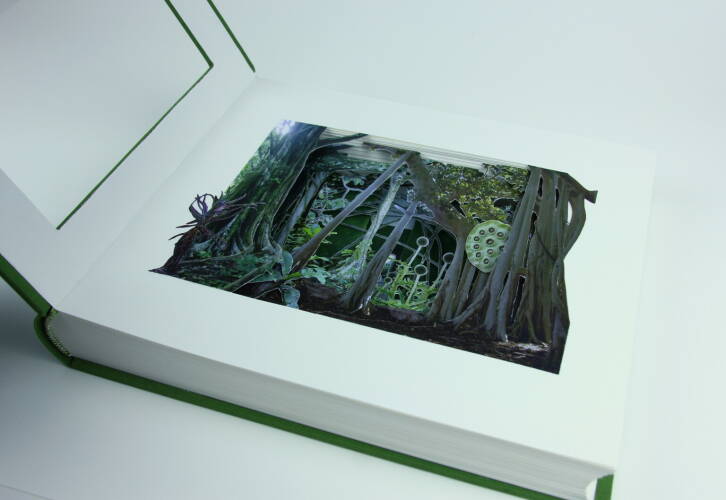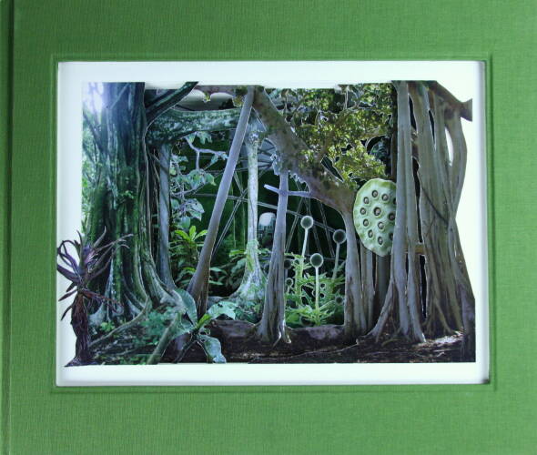 Comments: Handbound book with three-dimensional hand-cut collage based on own photography; 170 g/qm Gerstaecker paper, green bookbinding linen, hand-stitched headband, signed and stamped. The book measures 25cm x 30cm x 4,5cm when closed.