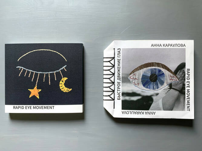 Now everything in the work surrendered to the idea of the dream. The shape of the book allows us to fall into the images, as we do in sleep. The name of the book — Rapid Eye Movement — comes from the name of the phase of sleep in which we actually see dreams. While dreaming, the brain decides what information needs to be stored and remembered, searches for connecting threads between different pieces of information, moves the “data cards” through the “file cabinet” and builds them according to its own algorithms. In other words, sleep is a process that, on the one hand, is regulated by our brain, and on the other hand, is not completely controlled by us. As well as the idea and form of the book, partly given me by machine intelligence.