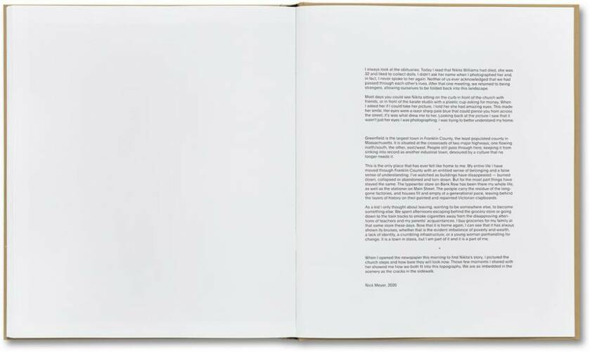 Nick Meyer grew up in a small mill town in Western Massachusetts and since his youth the town’s terrain has been in flux, with houses and shops continuously erected, razed, and rebuilt in the chasm left by disintegrated industries. The Local documents a town caught between aspiration and decline, a deeply personal account which reveals the struggles, tumult, and everyday life that occur in a place which, from the outside, appears caught in stasis. The experience depicted here is of strangeness and familiarity: the rhythm of change might be recognisable but the parameters have shifted, with opioid addiction and economic crises joining the steady thrum of deindustrialisation in defining the deep-seated volatility.