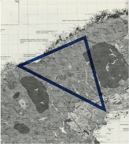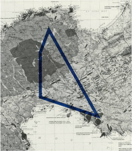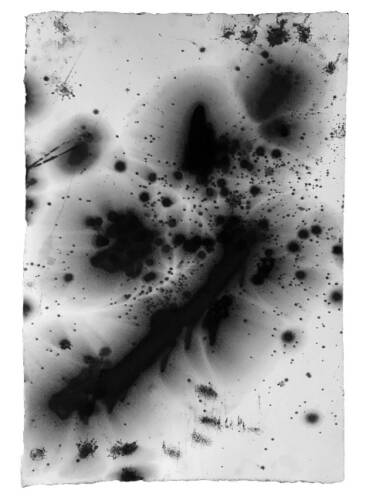 "Journeys through the Penwith peninsular indexed through motor oil leaked from a car engine onto paper. A chance study that developed into a rudimentary method of measurement. The predetermined and geometric nature of multiple car journeys is dissolved into the fluidity of leaking oil. The work is an exploration of the myriad contradictions of oil as a substance and our relationship with it. The leaked oil bleeds onto the paper and over time changes from static negative space to an expanding orange halo. Stored solar energy, the blood of the earth, diffusing on paper." — Jack Whitefield