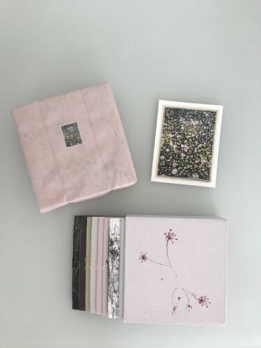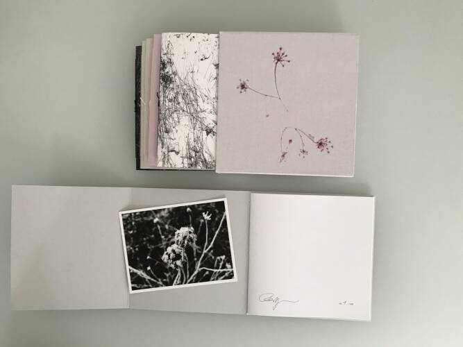 Comments: Collector's Edition of 20 copies with a signed print (20 different motifs, size: 18 cm the longer side, printed on Hahnemuehle PhotoRag Ultra Smooth). Book: 20 x 20 cm, eight handbound booklets in a linen slipcase. More than 20 different papers have been used for this book. One of the booklets (Frost) is printed with silver on black paper. Edition of 300 signed and numbered copies. Prices (by sold copies): 1-10 Euro 180 (sold out), 11-15 Euro 250 (sold out), 16-20 Euro 350.