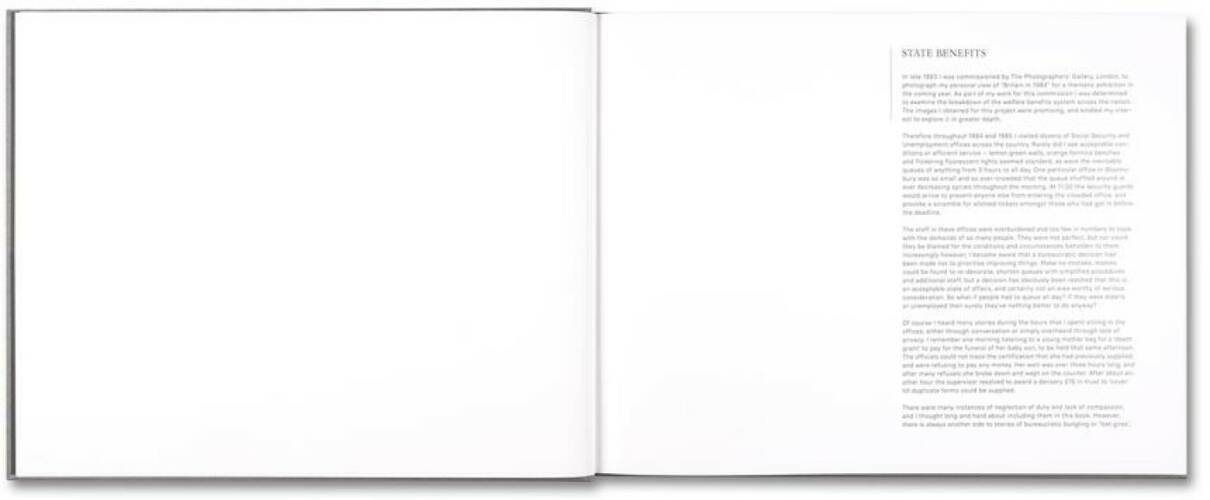 Originally self-published in 1985, Paul Graham’s renowned series, ‘Beyond Caring’, was made in the waiting rooms and corridors of the Social Security and Unemployment offices around the UK, documenting the long waits, queues and poor conditions of an overburdened system, to produce a powerful series of photographs conveying the hardship people experienced. Denied official permission to make the work, Graham’s photographs were taken discreetly, usually without looking through the camera, resulting in a spatial disorientation that emphasised the unmoored distress of vulnerable citizens. The work shocked many on its release – leading Magnum photographers were outraged by its use of colour in a classic documentary topic, while others celebrated how it straddled the world of activism and art (it was exhibited at both Trade Union conferences and the Museum of Modern Art, New York). Graham forged a fresh form of engaged photography, mixing elements of social documentary, ‘new colour’ and reportage to create a striking body of work that endures to this day. Many decades have passed since their making in 1984, but these images have grown not only in photographic importance, but also as a unique historic record of the mid-1980s unemployment crisis in the UK. This edition of Beyond Caring is part of Graham’s iconic 1980’s trilogy of UK books, being republished by MACK, which also includes A1 – The Great North Road (2020) and Troubled Land (Spring 2022).