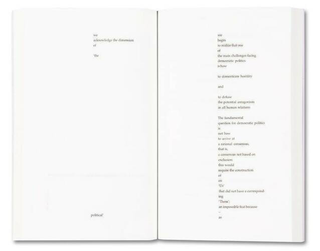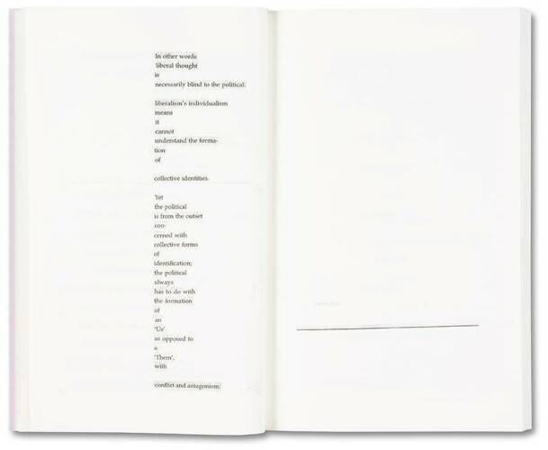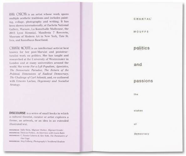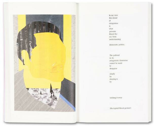 In 2009, the artist Anna Ostoya created a booklet with textual collages using an essay by the political theorist Chantal Mouffe, ‘Politics and Passions: The Stakes of Democracy’ (2002). In the essay, Mouffe critiqued the then-dominant ‘beyond left and right’ politics of neoliberalism and warned of its dangers – the rise of right-wing populist parties. Fascinated by Mouffe’s strikingly prophetic ideas, as well as her bold call to fight the status quo in order to radicalise democracy and to prevent violence, Ostoya returned to the booklet in 2019. She composed for it a series of portraits based on sketches of people on the New York City subway and on reproductions of her paintings and collages from the preceding decade. She also conducted a conversation with Mouffe about the politics of the last forty years, about the contemporary moment and about art, which is included in this publication.
