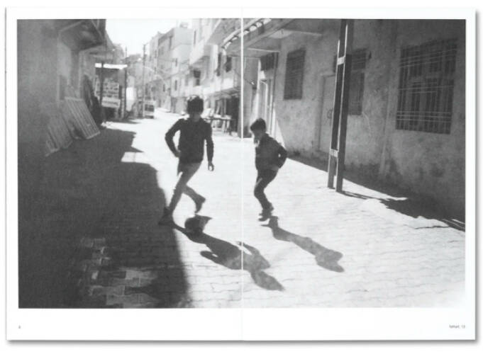 In these images, produced by the project’s young participants, the city of Mardin and the vast Mesopotamian plain beyond become a backdrop to the miraculous dreams, games, and discoveries which play out within the space of the frame. In occasional moments, the war nearby is hinted at: a fighter plane enters the frame of an otherwise clear sky; a child peers out from inside a UNHCR box. But rather than reiterating scenes of suffering and trauma, these images depict their environment afresh through the unmistakable, wonder-filled gaze of a child: a vision punctuated by surprise and play, in which friends and family are captured mid-flight, upside down, leaning out of windows, and whimsically disguised.