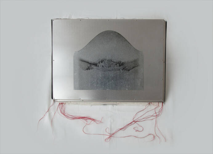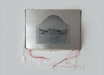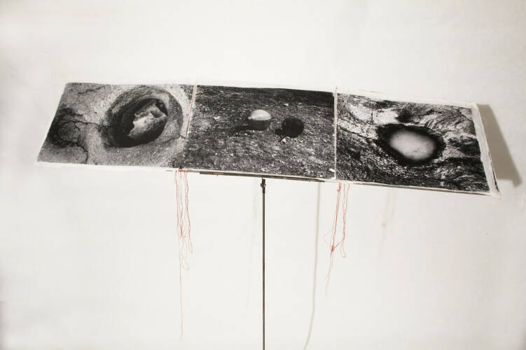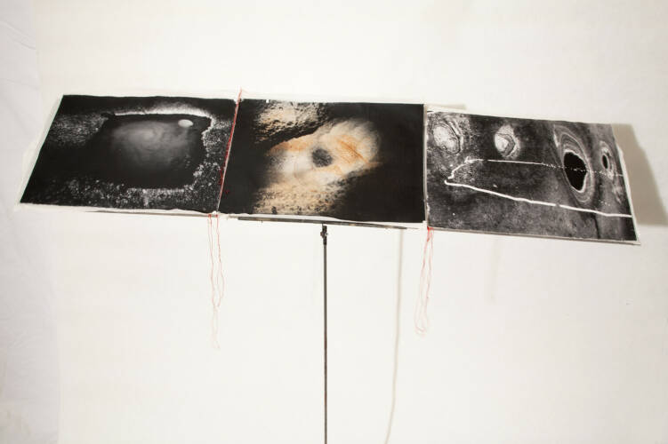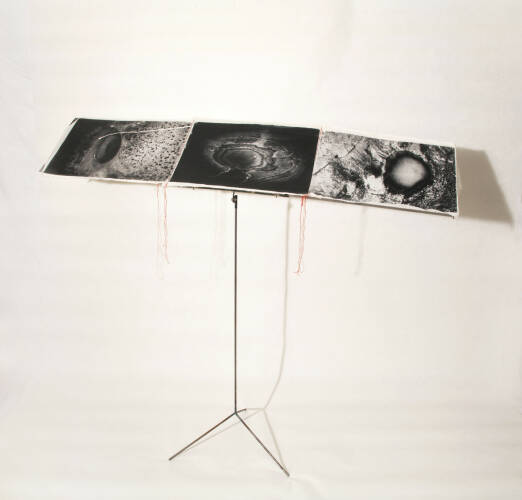 Unique handmade book made by the artist herself. There are 6 triptychs composed of 3 silver gelatin prints done by the artist on aquarelle paper, 37x53 cm each photograph. They are marouflée on cotton fabric and seaw with red threads. Each set mesures 40x 165 cm. The portfolio is done with cartoon and aluminum , on the cover is a silk screen print on a metal shape. The images of the Earth surface are dramatic , they look like some lonely , abandoned planet , mysterious light is suggesting that there is an unknown space around - It is a fascination by the beauty of a primer matter. The book can be placed on an iron structure similar to the tripod for the music partition /score/.