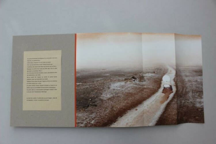 Gabriela's work is totally interwoven into the shape of the book where the straw cardboard responds to the old squared paper (where the text is printed), while the photos laminated on grey cardboard the outside of the pages. Architecture is at the epicentre of the structure and in the plaster creations integrated in the cut-out forms. If the book's framework evokes a sense of simplicity through the neutrality of a poor cardboard, the photographs printed on Japanese cotton paper bring a sober refinement to the whole. The last page of the book is clear and through a cut-out window (with a random shape), the colophon signed by the authors appears as an epilogue. Once the book has been read and explored (it requires some manipulation on the part of the reader), the mystery of the author's spiritual quest remains, in close concordance with the artist's interventions. This mystery, barely touched upon, impenetrable and complex, which we brush up against when opening this strange book, nevertheless remains with us for a long time once the last page is closed.