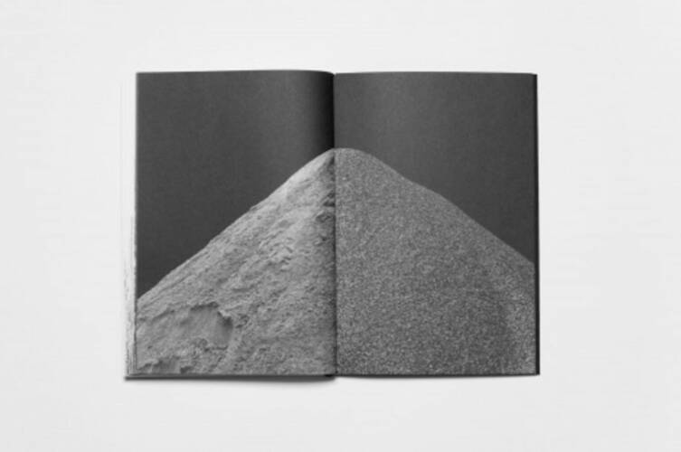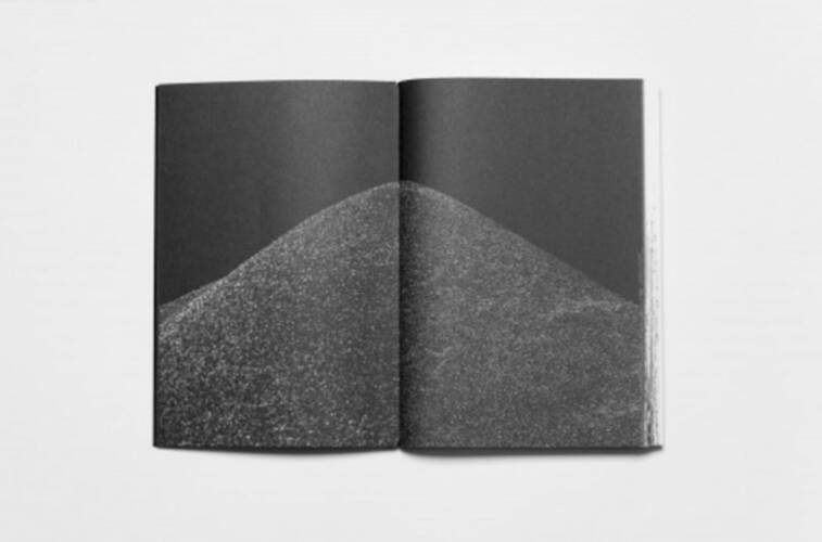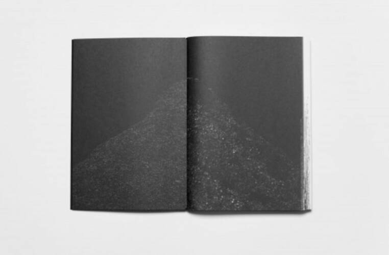 The volume unfolds as a circular paper dance between opposites continuously swapping the lead. The narrative starts with five completely blacked-out pages that progressively sublimate into an all-white double-spread sitting right in the middle of the volume: the peak of the day, the mountain top, the sharpest, protruding fore edge of the book.