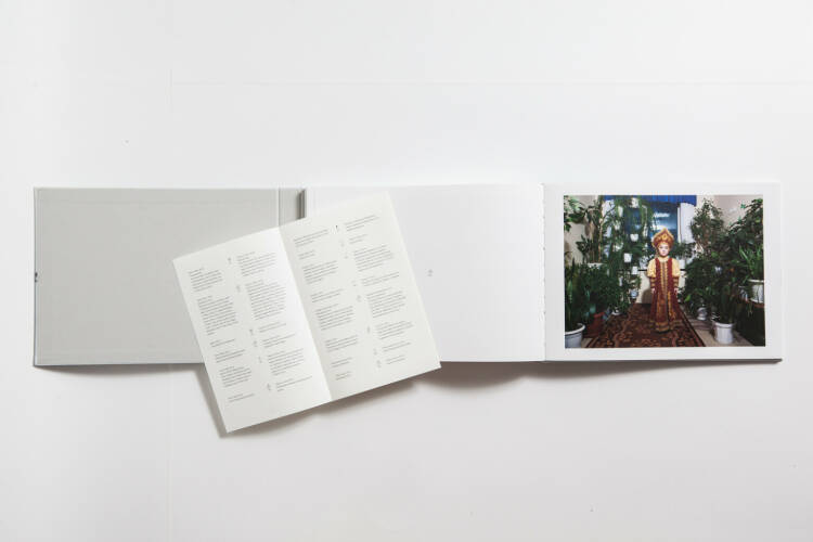 Comments: Handmade 3-gate around the book hard cover, open swiss binding, additional Laporello information booklet in the back cover pocket. 285 X 210 cm. Language: English, Russian. Book concept and graphic design by Anna Moseeva.
