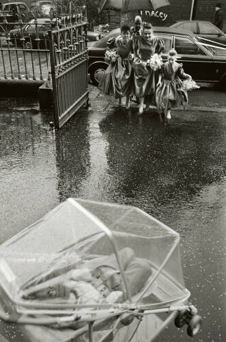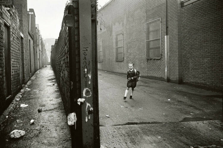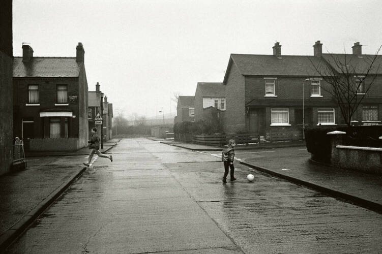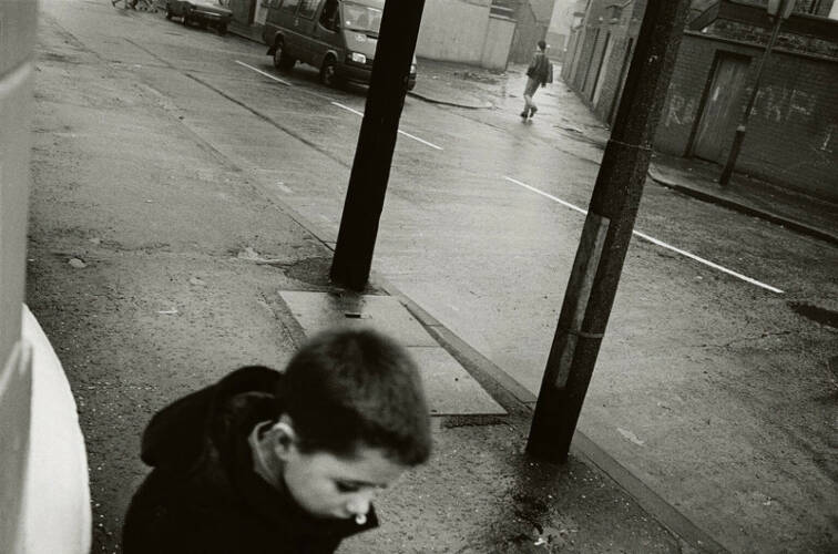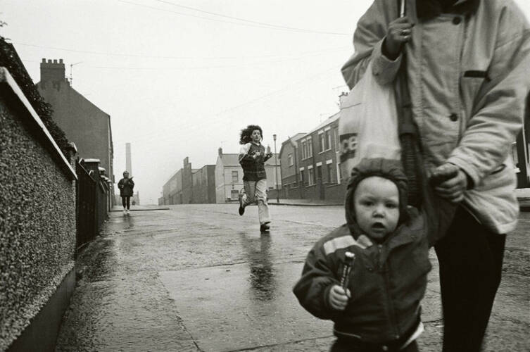 Clement’s process remained the same for his time in Belfast, he moved through the city turning his lens on the faces and landscapes he found there; the children going to school, the shop fronts and the windows of private homes, the moments of open space between buildings. Yet in Belfast, the mood is different, not by design or by a change in approach but by the nature of the subject. Belfast in 1991 had seen decades of conflict, the ceasefire of 1994 still some years away, which, coupled with the decline of the ship building industry and economic policy of the later 20th Century had left great areas of Belfast in urgent need of regeneration. British soldiers wait in the front yards of private homes, children play in derelict-looking streets, Clement moves through them and documents without making judgement; he is not a journalist looking for an angle or a conflict photographer seeking to expose the truth on the ground.