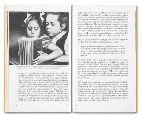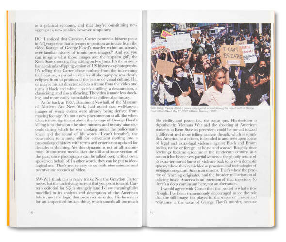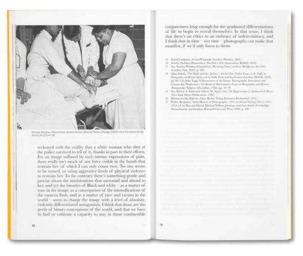 In a series of written exchanges, David Campany and Stanley Wolukau-Wanambwa consider the options for photography in resisting the oppressive orthodoxies of racial capital, conservative history, and neoliberal visual culture. How does the essential indeterminacy of photography square with the need to work out alternative practices? How is visibility achieved beyond the consensual categories of the mass media and the commodification of art? What models are there for the making and reception of photographic books and exhibitions that might cultivate an active spectatorship beyond boutique consumerism? These urgent questions and more are discussed in a spirit of speculation and possibility, in the light of signal events that have shaped the recent past.
