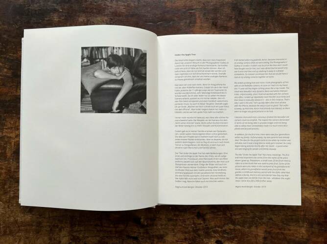 For her book project Under the Apple Tree photographer Regina Anzenberger invited her family members to portrait sessions and condensed the resulting works into an album. The pictures were taken with a Rolleiflex camera, mostly outdoors, in gardens that refer to the apple tree in the title. Analog technology is a crucial element of the series. Today, it is an anachronism, just as the photo album or the family portrait genre itself is. All the small steps that are necessary for the analog process: inserting the film, focusing, rewinding – and the mystery of an image that is created without being immediately visible – contribute to its ritual character. The eponymous apple tree is both an actual setting, anchored in the photographer's biography, and a mythical place: a place of longing to which there is no return and which is not dissimilar to photography, which always powerfully evokes a present that is always already past.