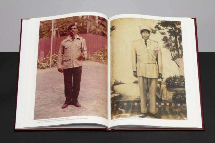 Suriname is the only Dutch-speaking country in South America. The former Dutch Guiana, it lies between French Guiana and Guyana on the continent’s northeast coast, and gained full independance in 1975. If the country’s police band seems an unlikely subject for a photobook, it is only because outsiders do not appreciate the social and political place of the band in the fabric of Surinamese society. It provides music for both official state and private events, and is considered an important part of the cultural scene in a country that has so recently attained an independant sense of identity.The book can be considered ‘the book of the film’ of the same name by Afra Jonker, yet it is a separate creation by photographer Sara Blokland and designer Willem van Zoetendaal. Like many contemporary photobooks, it is a multi-media production, in that Blokland’s photographs of the band are combined with historical photographs taken from their archive. These are combined with her comprehensive documentation of the current band, which begins with formal portraits of all thirty-two members, folowed by images of the band playing or in rehearsel, and then details of their instruments, uniforms, insignia, shot in a looser style. Indeed the book displays three or four styles or genres playing off each other in a typically Dutch manner. This in fact might be the Police Band’s ‘company book’, and Van Zoetendaal employs Dutch company book techniques, using blocks of almost full-page pictures, along with many smaller images in grids that not only enliven the book but catch visually the rhythm of music.