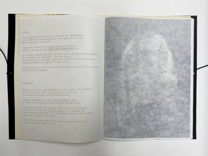 These sculpural photography, I call them "BUDDHAS", arose after the construction of my exhibition in the Textil Museum in Krefeld/Germany. Figures wrapped in silk in b/w and in color. Printed on Murakuma Kozo select White 42 gr. The visual repetition relates to historical concepts. The structure of the photos, which is created by creasing and ironing, give the impressions of an endless expanse of figures in space. With this project I want to preserve memories and record the passage of time.