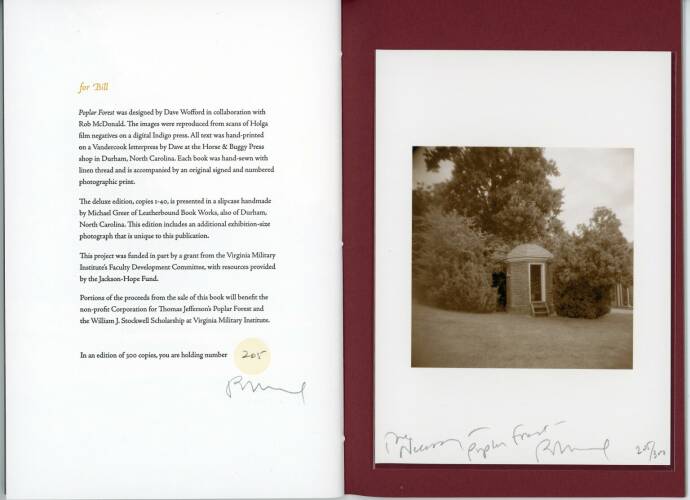 Jefferson visited Poplar Forest regularly during construction and after the house was complete. He found there, as he wrote to a friend, “the solitude of a hermit.” Rob McDonald’s photographs of Poplar Forest explore the notion of retreat, of private space, which we all—even a man so great as Jefferson—require and seek instinctively.