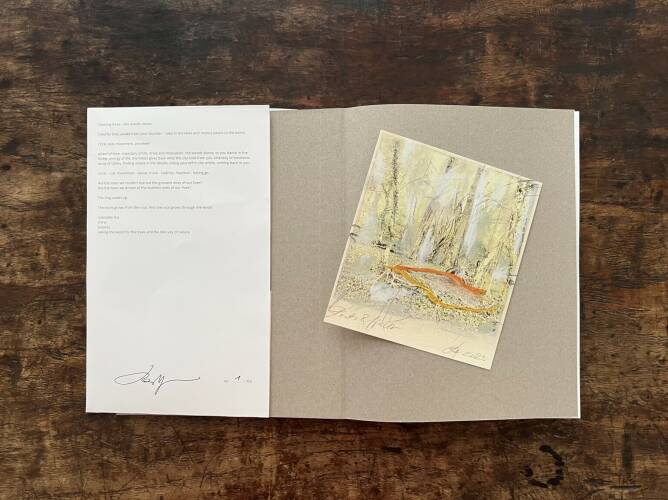 Comments: First edition of 350 signed and numbered copies incl. 25 collector's editions with a signed print. SIze: 24 x 18,5 cm. Hard cover with American dust jacket, thread binding. Inside Paper: Pergraphica Natural Rough 150 gr Cover: Garda Premium Natural 130 gr., 2 mm cupboard with 330 gr. Pergraphica Colours sensual brown. Endpaper: SH Recycling grey/grey. Book cloth: Toile du Marais 035088. Additional card: Pergraphica Natural Rough 300gr. Handwritten title on the cover.