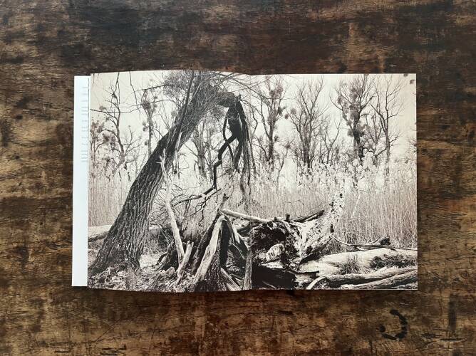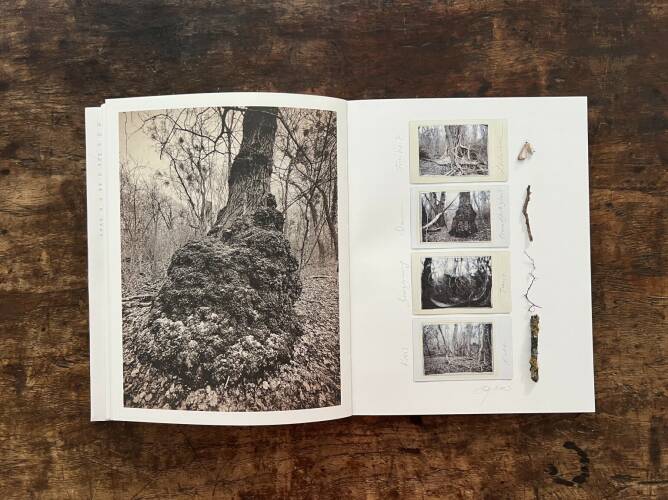 Roots & Waltz was inspired by a walk through the Vienna Danube riverlands. Regina Anzenberger went there with a friend during pandemic times, when everyone in Vienna was stuck indoors and going for walks outside. Having grown up in the countryside and having lived in Vienna for over 30 years, the artist noticed that her Viennese friends didn't actually leave the city when they longed for nature. Instead, they would go to the Prater-Auen, which is Vienna’s ‘Central Park’ and had served as the Emperor's hunting grounds over 100 years ago. The landscape, with its fascinating, wild natural forms, shares even more, leaving plenty of room for imagination. The artist conveys moods with her painted-over, drawn-on photographs, augmented with found objects. After the pandemic, the war in Ukraine began, and the whole world changed again. More questions arose regarding the essence of life, roots, and the future of the planet. The forest, as a source of creative inspiration and energy, became a refuge for many. Nature makes the soul dance, wandering through the floodplain forest, one could almost say, "dancing to the Danube Waltz."
