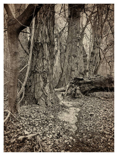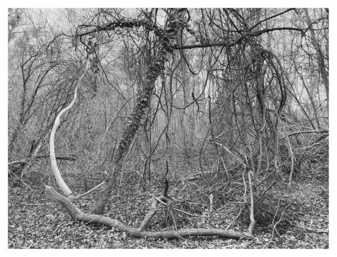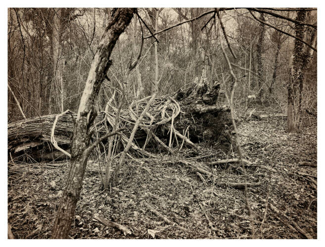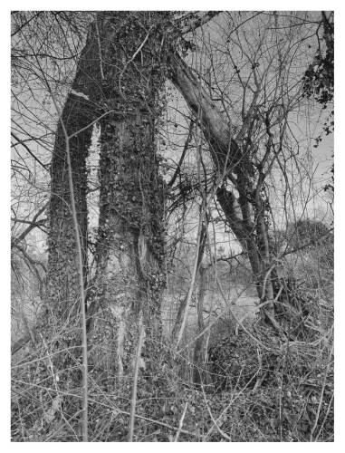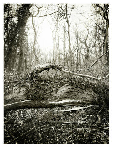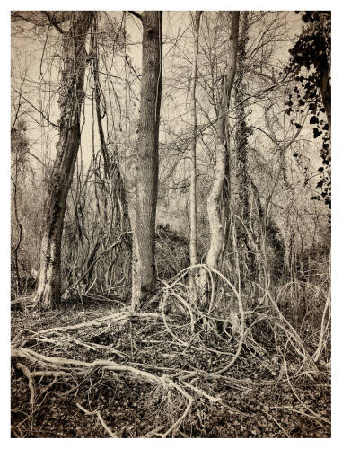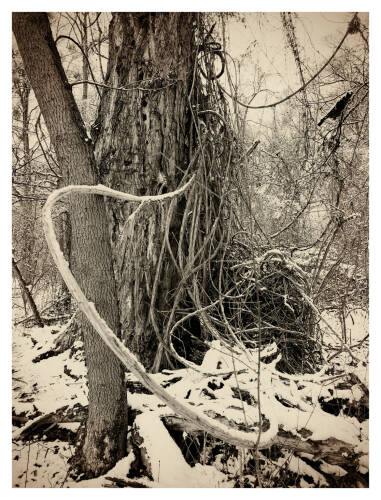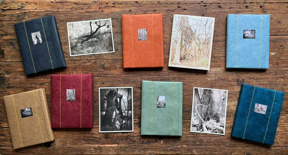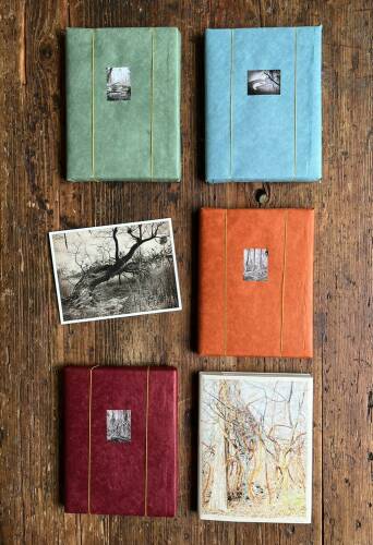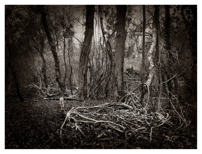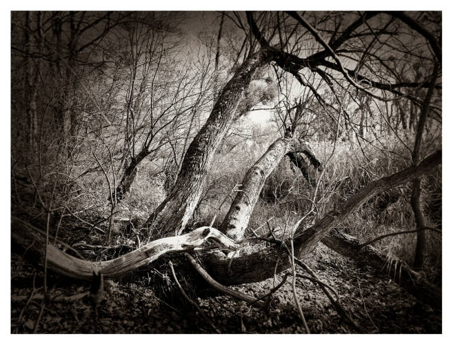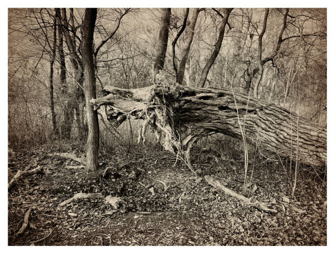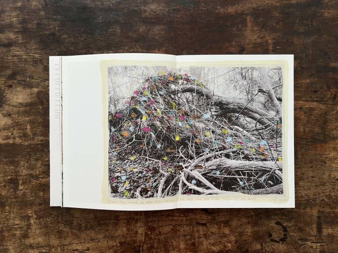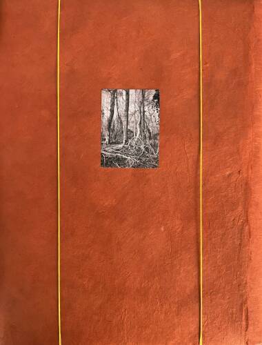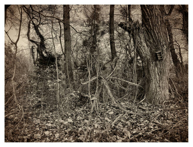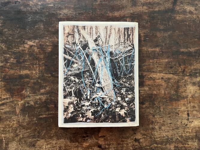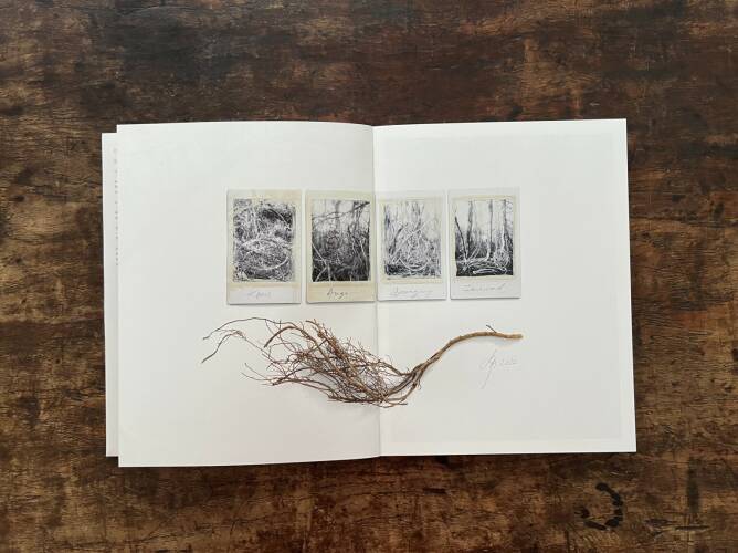 Roots & Waltz was inspired by a walk through the Vienna Danube riverlands. Regina Anzenberger went there with a friend during pandemic times, when everyone in Vienna was stuck indoors and going for walks outside. Having grown up in the countryside and having lived in Vienna for over 30 years, the artist noticed that her Viennese friends didn't actually leave the city when they longed for nature. Instead, they would go to the Prater-Auen, which is Vienna’s ‘Central Park’ and had served as the Emperor's hunting grounds over 100 years ago. The landscape, with its fascinating, wild natural forms, shares even more, leaving plenty of room for imagination. The artist conveys moods with her painted-over, drawn-on photographs, augmented with found objects. After the pandemic, the war in Ukraine began, and the whole world changed again. More questions arose regarding the essence of life, roots, and the future of the planet. The forest, as a source of creative inspiration and energy, became a refuge for many. Nature makes the soul dance, wandering through the floodplain forest, one could almost say, "dancing to the