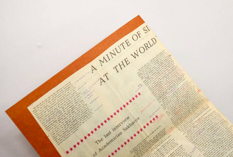 The title “The Last Conversation with Academician Sakharov” refers to a 1989 newspaper article in which an American journalist describes a meeting with Andrei Sakharov shortly before his death. As a talented nuclear physicist in the 1950s, Sakharov’s inventions led to the first Soviet thermonuclear bomb. At a later stage of the Cold War, when the threat of nuclear war was omnipresent, Andrei Sakharov became a very outspoken opponent of the arms race, and was known as a human rights activist across the world. In 1975 he was awarded the Nobel Peace Prize, but for a long time he was not allowed to leave the Soviet Union, where the communist regime considered him an enemy of the state. Rayss’s project could be seen as a dialogue with Sakharov, and touches upon the memories of this devastating period. She questions how the totalitarian state which conducted these “experiments” omitted to take responsibility for their consequences. The documents brought together give a subjective perspective on events that were visible and spectacular, but covered by strict secrecy for many years.