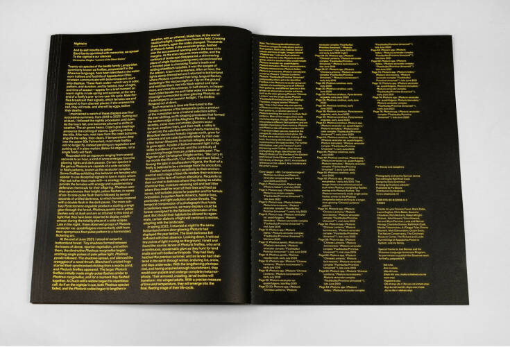 Twenty-six species of the insect family Lampyridae, commonly known as fireflies, have been identified in the foothills of Appalachian Ohio. For a brief moment at the very end of their lives, nineteen of these species communicate with silent, bioluminescent displays of wildly diverse flash patterns and colors—a kaleidoscopic procession of light varying in precise accordance to habitat, season and time of night. Since 2019, Samuel James has recorded these dialects of light with long exposures, exploring one luminous facet of life in the temperate deciduous forests of southern Ohio as it evolves through seasonal change atop eroded mountains and the stratified sediments of ancient seas.