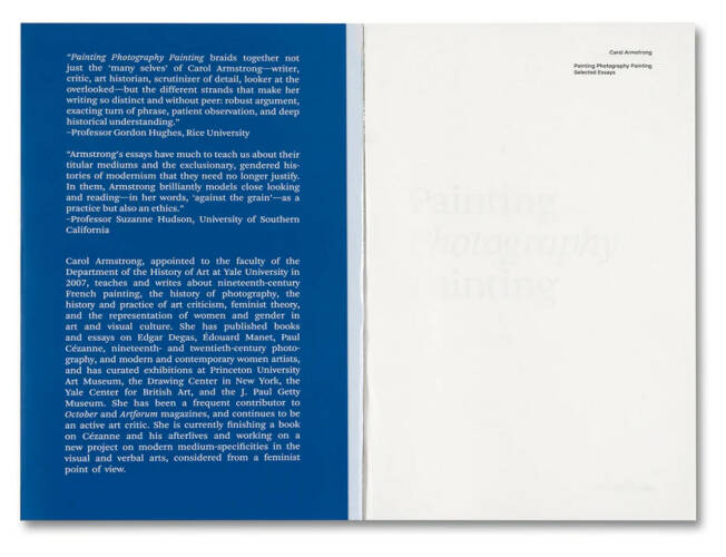 Considering these various works, Painting Photography Painting provides a compelling path through Armstrong’s decades of writing, weaving together figures from across the nineteenth and twentieth centuries including Helen Frankenthaler, Paul Cézanne, Ellen Gallagher, Georges Seurat, Julia Margaret Cameron, Tina Modotti, and Diane Arbus in a single, illuminating volume.