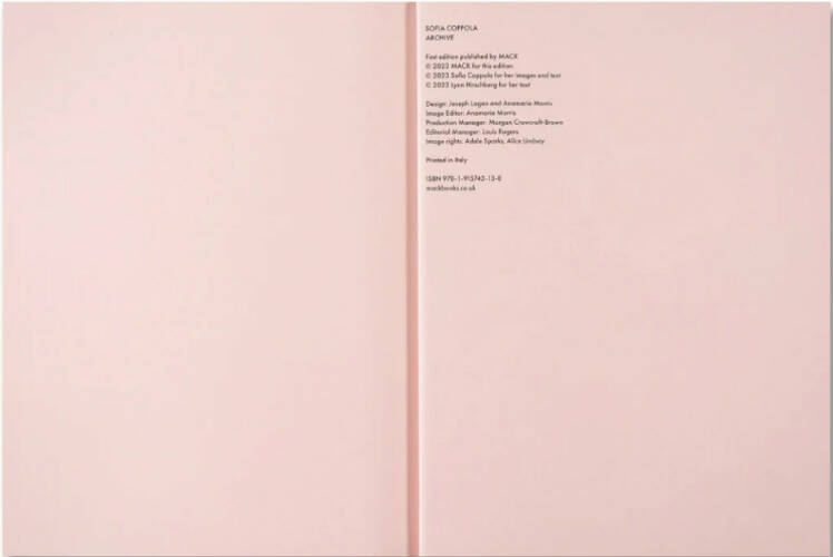 Archive is the first book by Sofia Coppola, covering the entirety of her singular and influential career in film. Constructed from Coppola’s personal collection of photographs and ephemera, including early development work, reference collages, influences, annotated scripts, and unseen behind-the-scenes documentation, it offers a detailed account of all eight of her films to date. Mapping a course from The Virgin Suicides (1999), through Lost in Translation (2003) and Marie Antoinette (2006), to The Beguiled (2017) and her upcoming feature Priscilla (fall 2023), exploring Priscilla Presley’s early years at Graceland, this luxurious volume reflects on one of the defining and most unmistakable cinematic oeuvres of the twenty-first century.