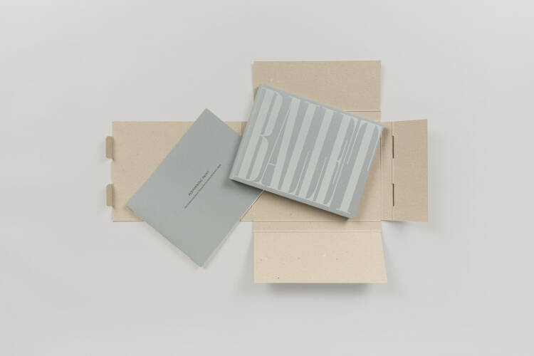 The uncoated book paper is Jupp Crääm, produced for Römerturm Feinstpapier. The cylinder-moldmade endpaper is Hahnemühle Pro Arte Ingres. The dustcover paper is f.color, produced by Gmund Papierfabrik for Schabert. All three papers are wood- and acid-free and meet the permanency standards of ISO/DIN 9706. KöhlerBook pH 7.5– 9.5 and KöhlerBox pH 7.5–9.5 were used respectively for the coverboards and the portfolio box; both were made on a cylinder-mold paper machine at Köhler Pappen in Gengenbach and are alkaline-buffered to enhance permanence.