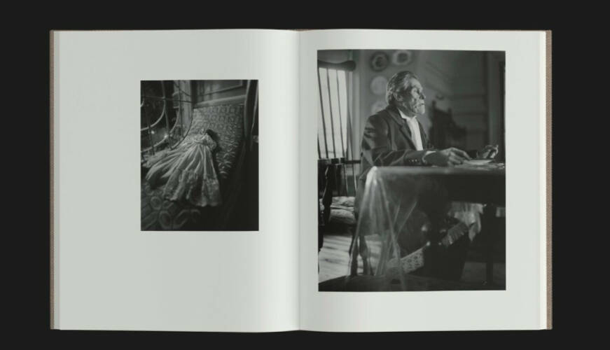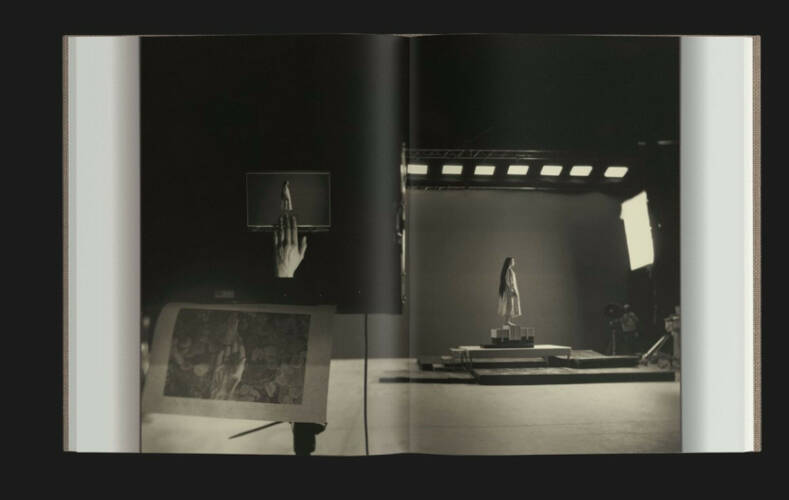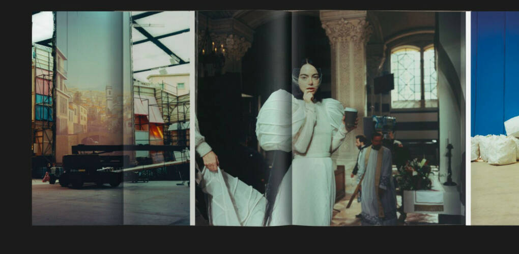 'Dear God, the Parthenon is still broken' is a photographic vignette by Yorgos Lanthimos. Although created on the set of the film 'Poor Things' in Budapest, the book inhabits a separate world, untethered from time and place. The photographs drift between black and white and colour, giving the impression of a waking dream between past and present, whilst multiple layers between reality and fiction are gradually revealed. The film was set in various late 19th century locations including London, Lisbon, Marseille, and a cruise ship—all recreated in Budapest. These constructed cities and interiors provide the backdrop for the photographs. The characters populate these imagined cities whilst the precarious screens, scaffolding, rigs, lighting and crew are divulged on the periphery of the images. Lanthimos has intentionally widened the frame to show the workings of the construct, fabricating a new story within the story. To mirror this, the publication is designed with foldouts to reveal these constructs within the cast of characters—the reader opens a book within a book.