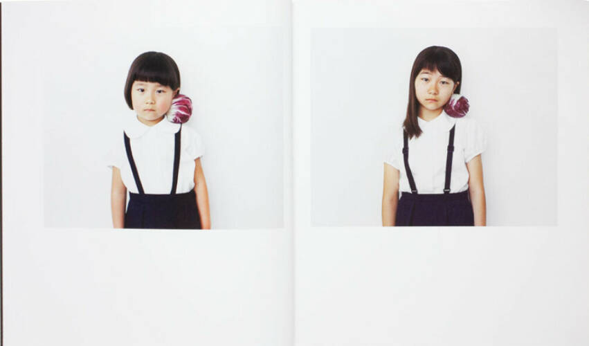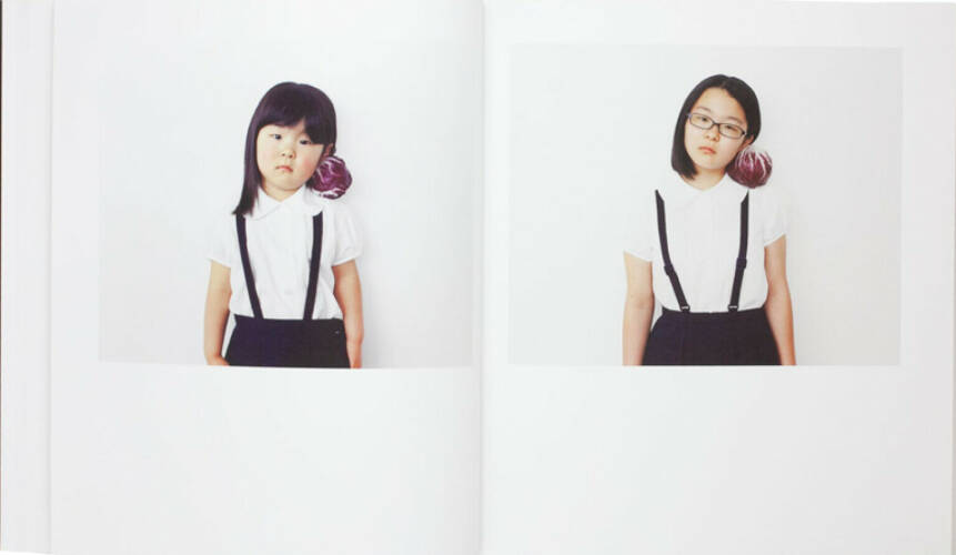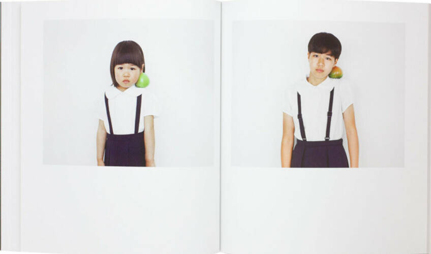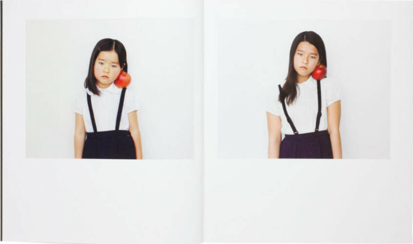 For “After Children,” Yokonami asked a number of his subjects, now junior high-school students, to restage the photographs of their childhood. Dressed in the same outfit, their hair and the fruit matching the photographs taken years before, the girls pose once again for the camera. In the photobook, each person’s photographs are juxtaposed, leading the viewer to observe, compare, and imagine.