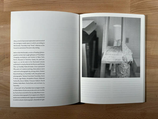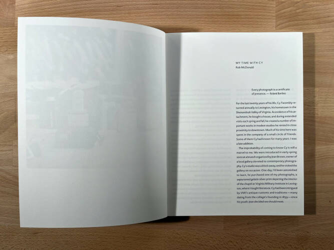 For the last twenty years of his life, Cy Twombly returned annually to Lexington, his hometown in the Shenandoah Valley of Virginia. As evidence of his attachment, he bought a house, and during extended visits in both spring and fall, he created a number of important works in modest studios he rented nearby. In large part, however, he spent his days observing the rhythms of the small college town, taking long reflective drives in the countryside, and exploring entertainments with a small circle of acquaintances. One of those was photographer Rob McDonald.