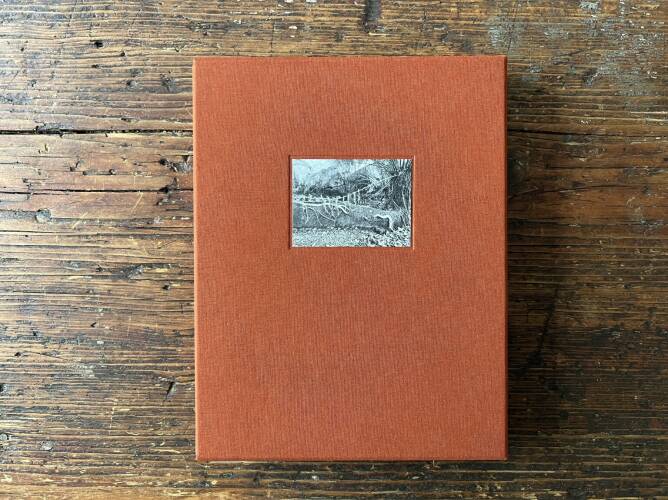 Comments: linen box of approx. 27,5 x 21,5 cm with four handbound booklets in 3 sizes (19,8x15,3 cm, 23,5 x 17,6 cm, 27 x 21 cm) first edition of 300 signed and numbered copies including 25 collector's editions with a signed print in the size of 26 x 20 cm (25 different motifs). Paper inside: Munken Lynx. Papers outside: Mohawk Renewal Hemp 325 gr, Pergraphica Colours gentle brown 250gr, Box outside: Wicotex Brillanta Rost 4045; Box inside: IQ COLOR blue Prices (by sold copies): 1-10 € 220 (sold out), 11-15 € 280, 16-20 € 350, 21-25 € 390,-.