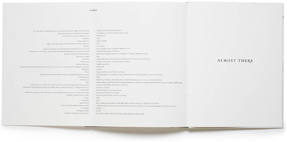 Almost There is a book work which presents a challenging constellation of images; vast Canadian terrains precede archeological images of Neanderthal remains, which settle between found objects. Landscapes and skyscapes partner animals and interiors, all culminating in an overriding sense of distance and displacement. Almost There is a constant return journey, an exploration of what is closest and what is furthest away. Ultimately Plademunt communicates his frustration, of never being close enough and never being far enough away, just managing to be almost there.