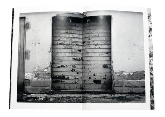 He wanders through a vacant landscape and town streets, scavenging fragments of evidence and scraps of memory, outlining a visual research into the fabric of a wounded town.