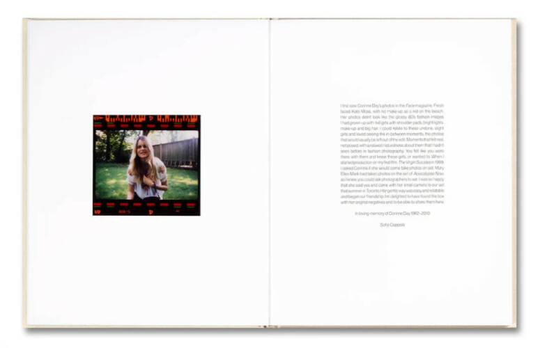 For her first feature film, The Virgin Suicides, Sofia Coppola commissioned British fashion photographer Corinne Day to join her on set. Renowned for her unadorned, grungy photographs of iconic models of the 1990s, Day’s representation of female beauty met its match in Coppola, whose debut marked the first of her unaffected, empathetic depictions of womanhood. Edited from Day’s original negatives, this volume, which launches alongside The Virgin Suicides' twenty-fifth anniversary, gives mesmerising and unprecedented insight into Coppola’s enigmatic staging of the Lisbon sisters and their suburban trappings.