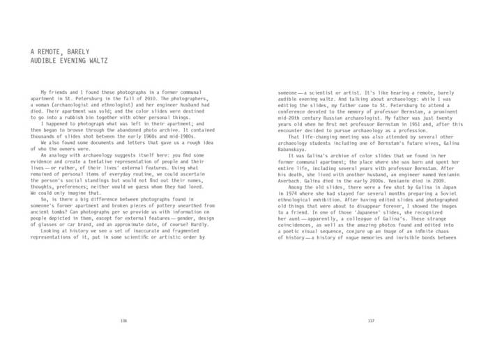 Max Sher's first book A Remote Barely Audible Evening Waltz examines how we perceive our past through images and what is the image of history in our collective minds. A collection of found photos edited into a poetic visual sequence plus a few images taken at the place where they had been found, the book also reveals a rare and unusual view of Soviet private life in 1960-80s.