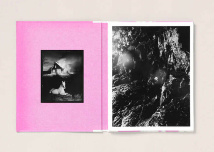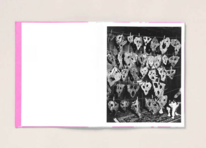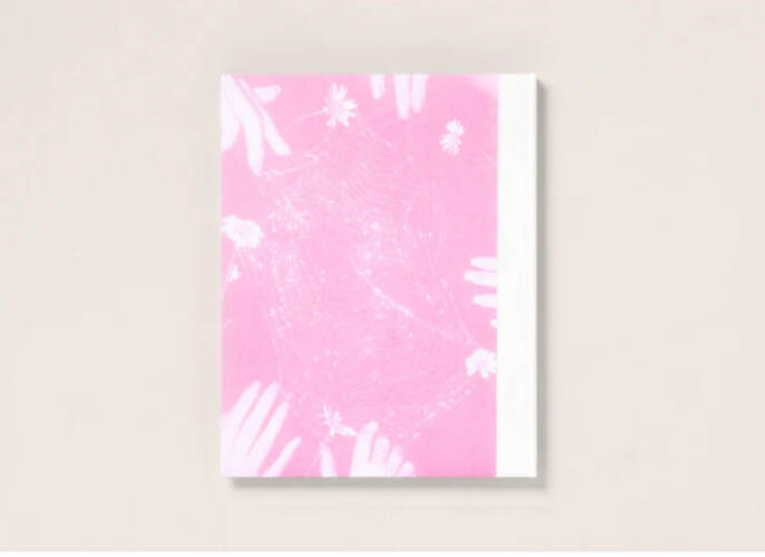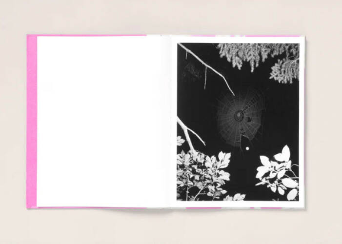 Presented as large format 3/4 Swiss bound volume, Flowers Drink the River's cover is replete with reproductions of an aged pink craft paper that Pia found stashed in an abandoned house down the road from her home. She then covered a spider web found along the river in a powdered red pigment and adhered it to the paper. Over this a cloth nameplate has been added, while the inside cover features a tipped on facsimile 4x5" contact print that she made in her bathroom.