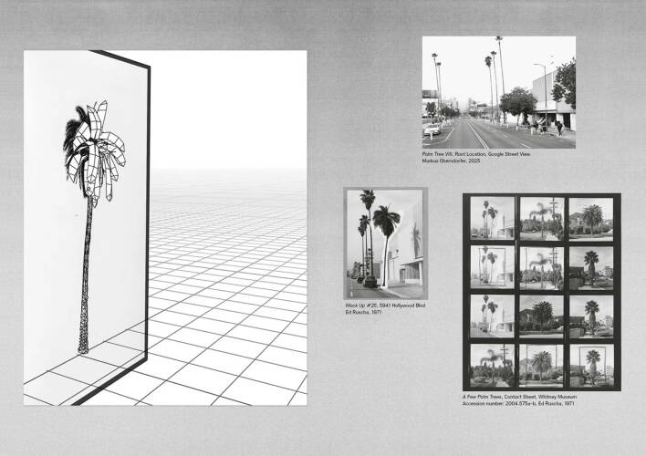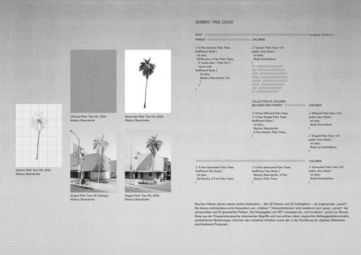 The juxtaposition of Ruscha's palm trees — based on analog photographs — and my derivative representations and medial excursions into the realms of 3D and generative AI, raises key questions about appropriation: what, and how much, of a source (parent) is transferred into, and retained within, a respective medium. At the same time, it examines the concept of the generated look-alike as a virtual image in relation to our concept of reality. It highlights the tension between recognizability and algorithmic re-creation, between resemblance and deviation, and aims to encourage a critical reflection of a complex, constantly changing multi-medial world — a world shaped by a network of data, its analysis and automation, as well as code. These considerations mark the beginning of an artistic search for roots and traces within the ambient noise of today's media landscapes.